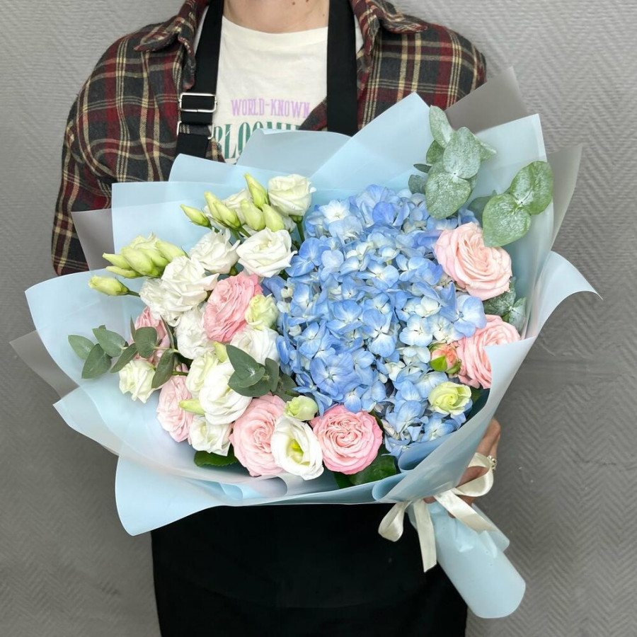 На фото букет «ледяная акварель». В составе: гортензия 1 шт, кустовая пионовидная роза 4 шт, эустома (лизиантус) 3 шт, эвкалипт 3 шт, дизайнерская упаковка 1 шт, атласная лента 1 шт, . Все цветы свежие и ароматные, букет красиво оформлен и отлично подходит для подарка. Доступна доставка цветов или самовывоз.